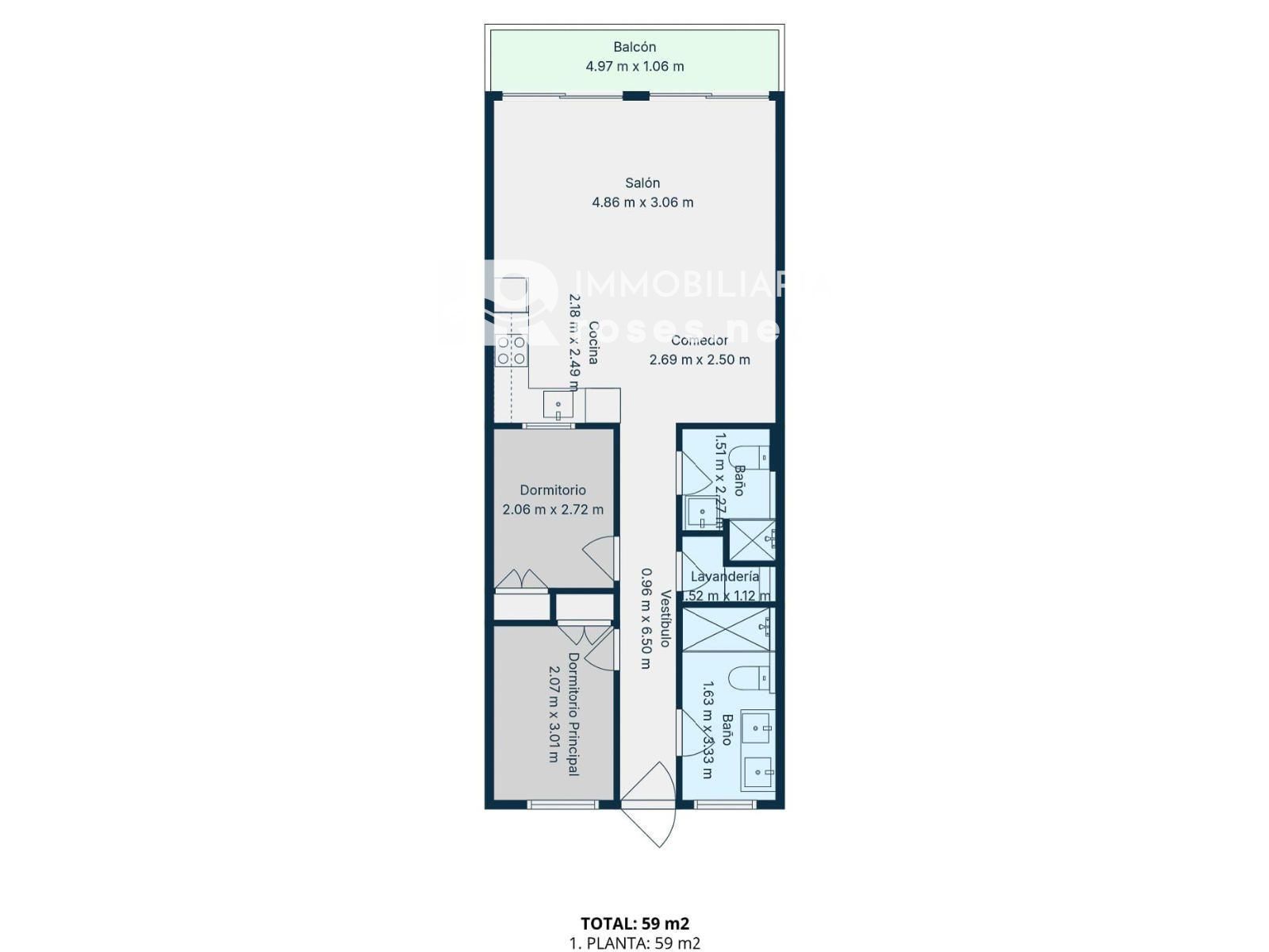 Die Immobilie ist aufgeteilt in zwei Schlafzimmer (eines mit Außenfenster und eines mit Innenfenster), ein großes und helles Wohn-Esszimmer mit komplett ausgestatteter offener Küche sowie Zugang zu einer sonnigen, südlich ausgerichteten Terrasse, ideal, um das mediterrane Klima das ganze Jahr über zu genießen.
